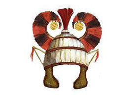 Fans of Homer’s Iliad will recognize this text “ Meriones gave Odysseus a bow, a quiver and a sword, and put a cleverly made leather helmet on his head. On the inside there was a strong lining on interwoven straps, onto which a felt cap had been sewn in. The outside was cleverly adorned all around with rows of white tusks from a shiny-toothed boar, the tusks running in alternate directions in each row.” We know that these ivory boar’s tusk helmets were used in the Mycenaean world from as early as 17th century BC to 10th century BC. With several discoveries of actual helmets carbon dating back to 14th century BC.